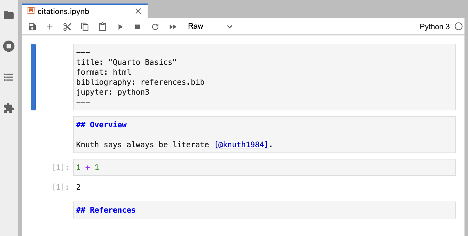 Here’s a notebook that includes a bibliography and single citation. Note that markdown cells are un-executed so you can see all of the syntax.