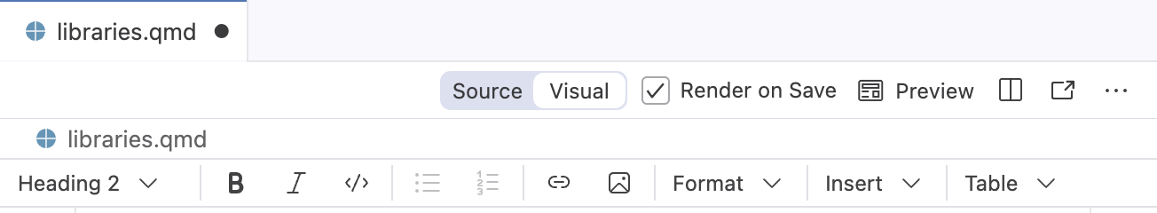 The toolbar in Positron with the Source and Visual buttons highlighted.