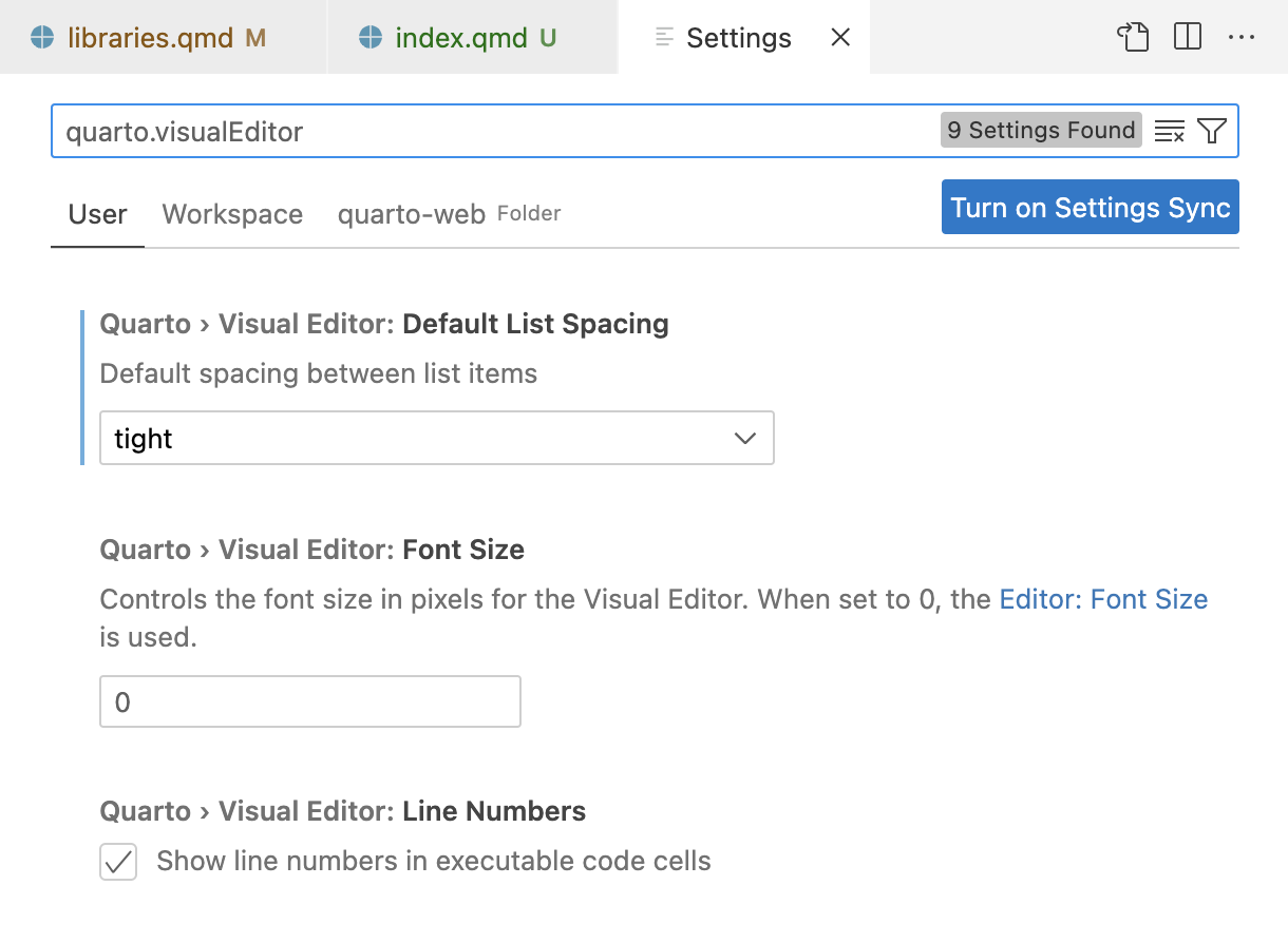 There are a variety of Positron options available to configure the behavior of the visual editor. You can locate these options by filtering on quarto.visualEditor in the settings pane: